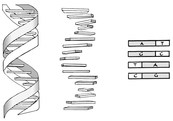 Из этого правила следует, что если вы видите только половины ступенек, крепящиеся к одному из спиральных остовов, то вы можете абсолютно точно предсказать, какие половины ступенек соединяются с противоположным спиральным остовом. Например, если последовательность половин ступенек с одной стороны представляет собой C, затем A, T и, наконец, G, то с другой стороны им будут соответствовать только половины ступенек G, T, A и C, именно в таком порядке. Половины ступенек представляют собой плоские геометрические молекулы, называемые основаниями; незыблемое правило, что C соединяется с G, а A – с T, таким образом, называется «спариванием оснований». Открытие данного феномена было признано заслуживающим Нобелевской премии, что представляется обоснованным, поскольку этот принцип лежит в основе генетических механизмов, которые делает каждого из нас тем, кто мы есть.