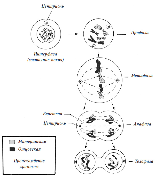 Рис. 3.3. Деление клетки (митоз) с указанием этапов процесса.