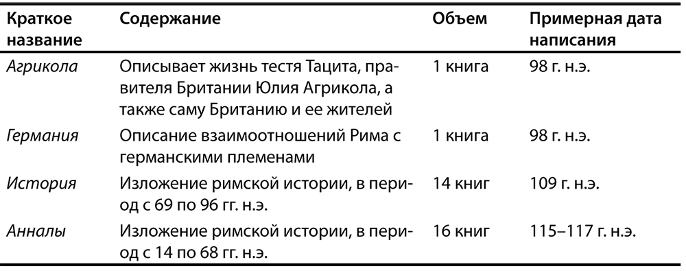Корнелий ТацитТацит родился около 56 года нашей эры и занимал ряд важных римских должностей, включая сенаторскую и консульскую. В наши дни он наиболее известен благодаря своим работам, представленным в таблице 1.1.[3]