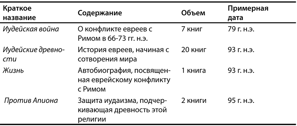 Иосиф ФлавийНаш третий нехристианский писатель – еврейский историк Иосиф Флавий. Он родился около 37 или 38 года нашей эры и умер примерно после 100 года. Иосиф командовал еврейскими войсками в Галилее во время их первого восстания против Рима в 66 году нашей эры. В 67 году он попал в плен к римлянам и по собственному утверждению, предсказал восхождение Веспасиана на престол в июле 69 года. Иосиф Флавий снискал расположение Веспасиана и последующих императоров, стал гражданином Рима и принял имя Флавий в соответствии с фамилией семьи Веспасиана. Живя в Риме он написал сочинения, представленные в таблице 1.2.