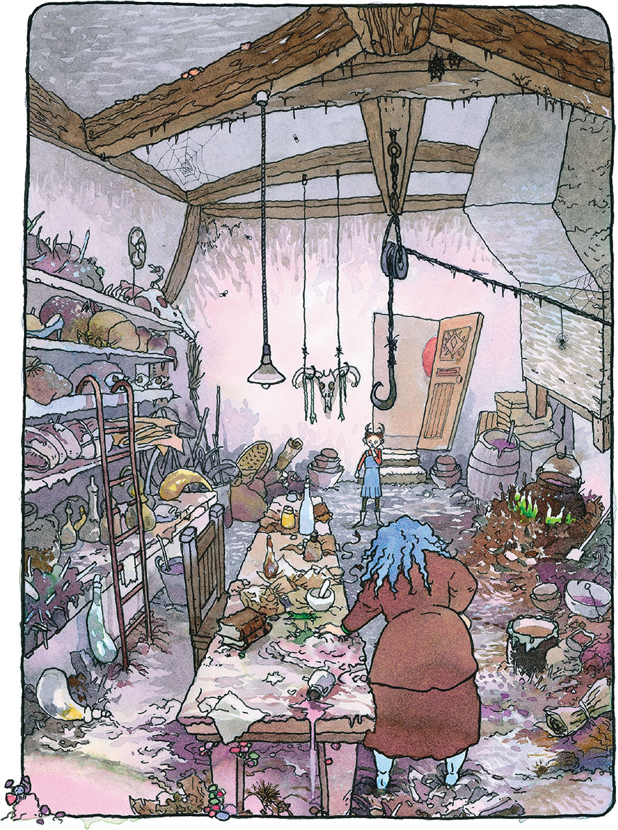 Всё было в грязи. На полу лежал толстый слой склизкой мерзости, состоящий из вековой пыли, зелёной плесени и всякого колдовского мусора, в основном маленьких белых косточек и мелких чёрных гниющих ошмётков. Этот слой грязи в одном углу образовывал горку, а на ней стоял ржавый закопчённый ведьминский котёл, под которым горел зелёный огонь. Гарью воняло ужасно. Ещё больше всякого разного вонючего – пыльные бутылки, какие-то старые коричневые пакеты, причём из некоторых что-то высыпалось, – лежало и стояло на длинном заляпанном столе и как попало громоздилось на полках. На полу возвышались целые башни из мисок и банок, и все они были покрыты копотью и бурой слизью.