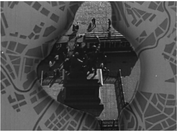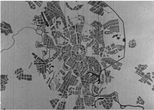 Претензии Злобина к картине хотя и несколько раздуты, но вполне справедливы. Судя по всему, попытка сохранить в «Городе большой судьбы» равновесие, представляя грандиозную будущность Москвы через внимание к разнообразным, подчас простым и будничным деталям, в самом деле закончилась неудачей. По ходу фильма теряется ощущение ясного телеологического развития, и вопреки благим намерениям кинематографистов городские пространства будто бы противятся попытке связать их в единое повествовательное целое. Одна сцена особенно примечательна в этом отношении. Начинается она со статичного изображения схематической карты Москвы (илл. 1а), в центре которой открывается большая дыра неправильной формы, чьи контуры совпадают с историческими границами города, и внутри них перед зрителем предстают бессистемные картины прошлого: едут запряженные лошадьми повозки и экипажи, по площади проезжает трамвай и прочее (илл. 1б). Запечатленная на кинопленку действительность, разворачивающаяся внутри опаленного по краям отверстия, своим относительно крупным масштабом и откровенной глубиной, а также прерывистым движением и быстротечной своеобразностью перевешивает и оттесняет статичную и плоскую карту, делая ее несущественной. Возникает стремление черпать опыт и знания, войдя в это пространство и отправившись следом за его трамваями и лошадьми, нежели возвратившись к простым линиям нанесенной на карту безликой поверхности.