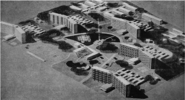 Илл. 3. Архитектурная модель развития района. Многоквартирные дома интегрированы в зеленый ландшафт, включающий две школы, санаторий, парк, дворец культуры, универмаг, летний театр, ботанический сад, стадион и фруктовый сад. Архитектура СССР. 1961. № 6. С. 38