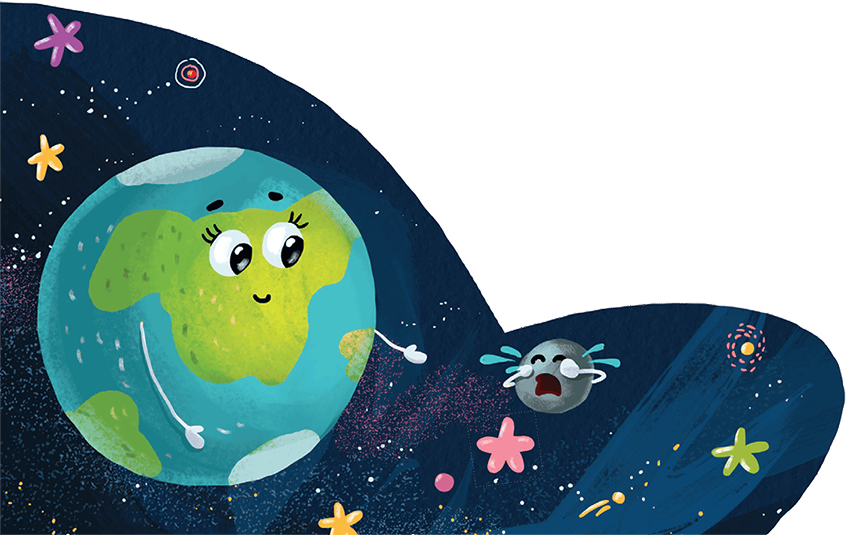 Давным-давно налетела на меня другая планета – Тейя. Она была меньше меня, поэтому сама разрушилась. Обломки её летали-летали вокруг меня и превратились в мой спутник – Луну. Теперь я не одинока.
