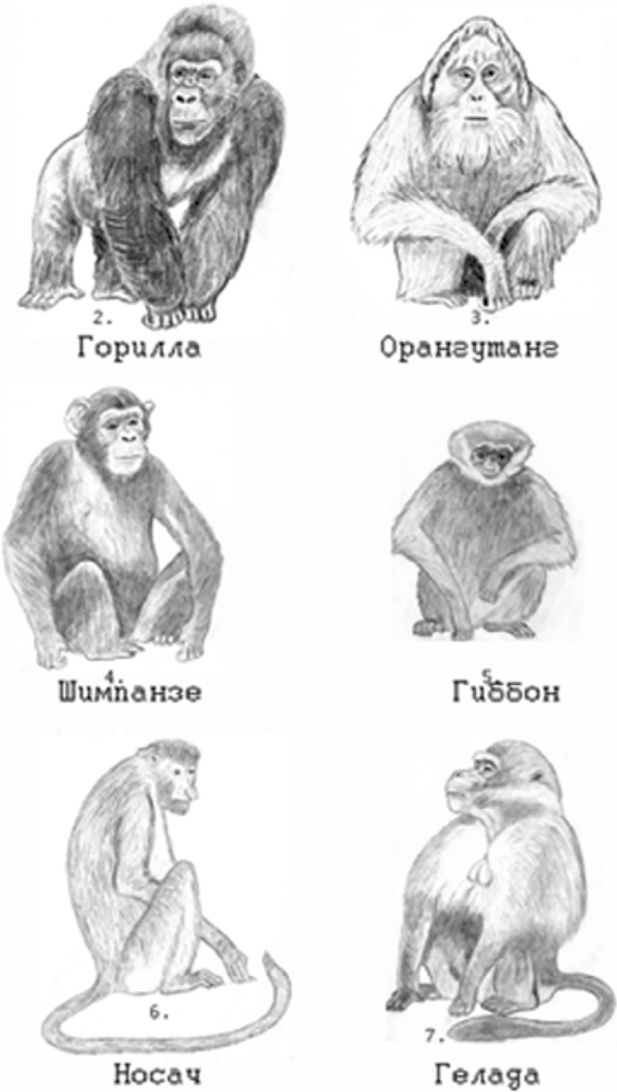 Рис. 4. Авторская перерисовка: 2 – горилла; 3 – орангутанг; 4 – шимпанзе; 5 – г иббон; 6 – н осач; 7 – гелада