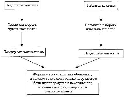 При обсессивном неврозе запрещен именно контакт, поскольку он подразумевает также и сексуальный контакт, и – в силу амбивалентности чувств – агрессивный контакт. Такое же уравнивание (контакта и агрессии) лежит в основе возгласа touché, издаваемого фехтовальщиками, touché означает: убит в результате касания рапирой. Также хорошо известна игра в «морской бой», в которой «касание» предваряет потопление на следующем шаге. По той же причине оголенный электрический провод называется «контактом». Если контакт отсутствует или чрезмерен, тогда он может ощущаться как болезненный или смертельный. Это похоже на болезненный поиск в стремлении или желании контакта или на самый обыкновенный контакт, болезненность которого обусловлена повышенной чувствительностью рецепторов, которые ради осуществления контакта стали гиперчувствительными в результате снижения порогового барьера защиты от раздражителей. Вследствие этого, вполне вероятно, будет формироваться бесчувственная оболочка или бесстрастное поведение с тенденцией к избеганию стимулов, развивающихся как реактивные образования (см. рисунок 1.2).