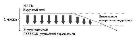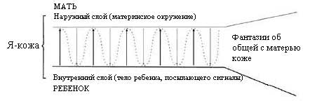 Фантазия об общей с матерью коже лежит в основе всего описанного выше процесса. Я-кожа может иметь внутренний и внешний слой. Материнская среда может быть внешним слоем, а поверхность тела ребенка может быть внутренним слоем, посылающим сигналы (рисунок 2.1).
