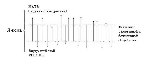 В фантазии об общей с матерью коже, в которой внешний слой блокируется и сообщения от внутреннего слоя поступают в искаженном виде, а всякое желание и попытка человека сепарироваться душит и убивает его, поскольку переживается как сокращение общей кожи, которую невозможно содрать.