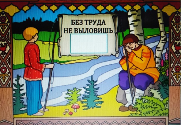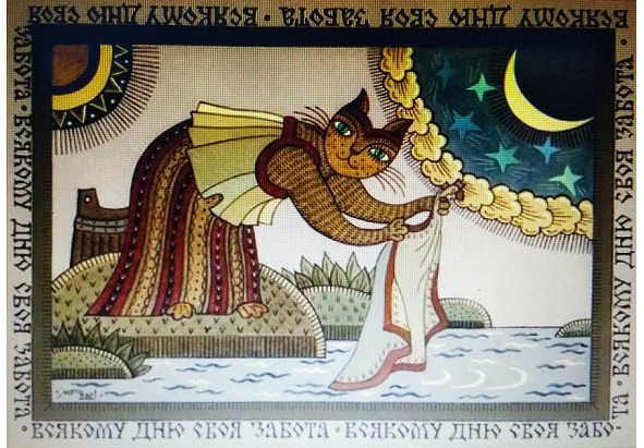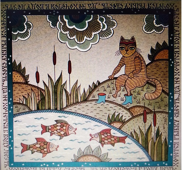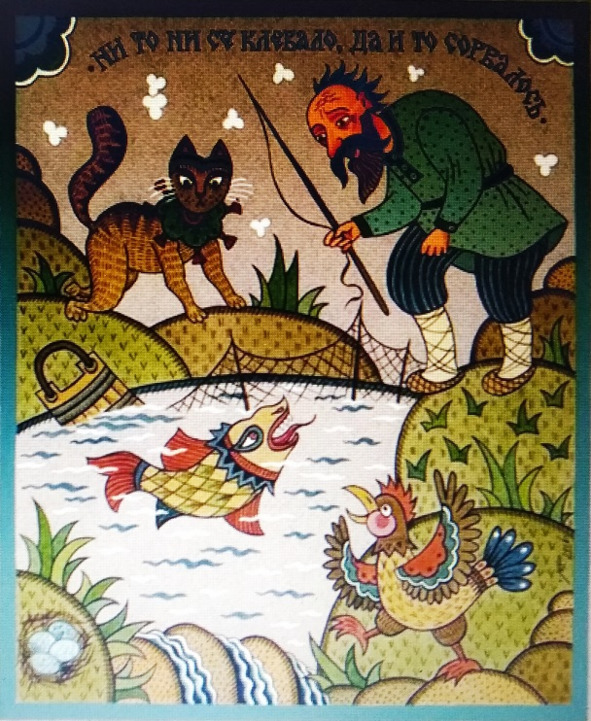Кот хочет рыбку сварить, снял сапог, чтобы водички в него для ухи воды налить, и вспоминает, как бабка ему говорила, что Демьянова уха хороша и что, она её очень любила, но сама никогда – не ловила!