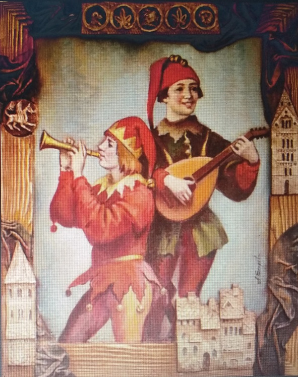 Скоморохи играют кто на чём, а одеты, как бы все в одном!