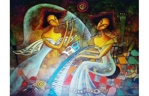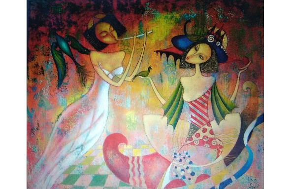 На картине, одна девушка играет, другая танцует. – Замечательно художник рисует!