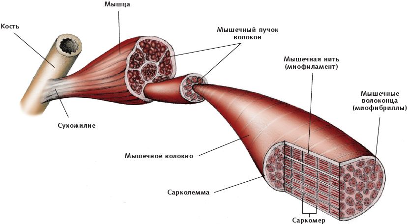 Каждое мышечное волокно состоит из небольших структур, называемых мышечными фибриллами, или миофибриллами (латин. mio – «мышца»). Миофибриллы расположены параллельно друг другу и придают мышечной клетке «слоистый» внешний вид, поскольку состоят из одинаково упорядоченных миофиламентов. Миофиламенты – это цепочки протеиновых молекул, которые под микроскопом выглядят как светлые и темные полосы. Светлые изотропные (I) полосы состоят из белка актина, темные анизотропные (A) – из белка миозина. (Третий вид белка, известный как титин, был идентифицирован и отвечает примерно за 11 % от общего содержания белка в мышцах.) При сокращении мышцы филаменты актина двигаются между филаментами миозина, образуя поперечные мостики, что приводит к укорачиванию и утолщению миофибрилл (см. «Физиология мышечного сокращения»).