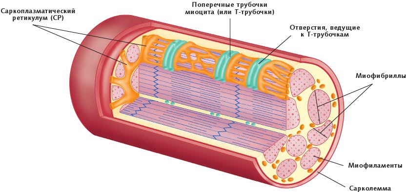 Волокно каждой скелетной мышцы представляет собой единичную мышечную клетку цилиндрической формы, окруженную цитоплазматической клеточной мембраной – сарколеммой. Сарколемма представляет собой своеобразные отверстия, ведущие к трубочкам, известным как поперечные трубочки миоцита (или Т-трубочки). (Сарколемма является своего рода ячейкой для сохранения потенциала мембраны, что позволяет импульсам, – в частности, это касается саркоплазматического ретикулума (СР) – либо генерировать, либо ингибировать сокращения.)