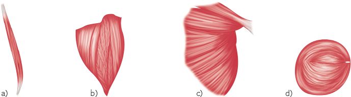 Рис. 1.3. Формы мышц: а – параллельные; b – перистые; c – суживающиеся; d – круговые