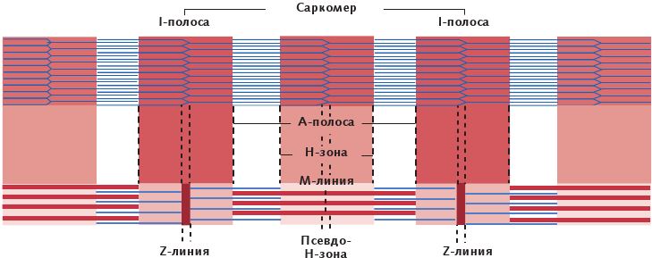 Рис. 1.4. Миофиламенты внутри саркомера. Саркомер связан с обеих сторон Z-линией; M-линия является центром саркомера; I-полоса состоит из актина, A-полоса – из миозина