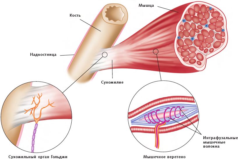 В то время как мышечные веретена контролируют длину мышцы, сухожильные органы Гольджи (СОГ) настолько чувствительны к напряжению в мышечно-сухожильном комплексе, что могут отреагировать на сокращение единичного мышечного волокна. СОГ по своей природе являются ингибирующими, выполняя защитную функцию и снижая риск травмы. При получении стимуляции СОГ ингибируют (тормозят) сокращающиеся мышцы (агонисты) и возбуждают мышцы-антагонисты.