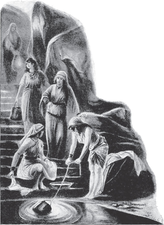 Тем же вечером, на закате, несколько женщин стирали белье на верхних ступенях лестницы, спускающейся к Силоамскому пруду. Девочка подносила им из пруда воду и пела, наполняя емкости из обожженной глины. Песенка была веселой и, без сомнения, скрашивала их труды. Время от времени женщины садились на корточки и, отдыхая, смотрели на склоны окружающих гор и на вершину, известную сейчас как гора Соблазна, едва различимую на фоне заходящего солнца.
