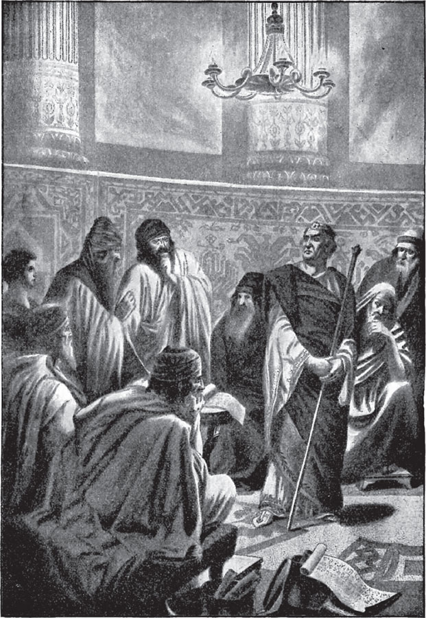 Поздно вечером, в час начала первой стражи, во дворце на горе Сион собралось человек пятьдесят из числа тех, кто никогда не собирался вместе, кроме как по прямому повелению Ирода и только в тех случаях, когда ему требовалось узнать какую-нибудь из сокровенных тайн иудейской истории или ее закона. Короче говоря, это было собрание законников, высших священнослужителей и глав религиозных общин, наиболее уважаемых в городе за их ученость. Здесь были ведущие теологи, толкователи различных вероучений, самые авторитетные саддукеи, самые пламенные трибуны фарисеев, спокойные, тихие философы-стоики из социалистов-ессеев[19].