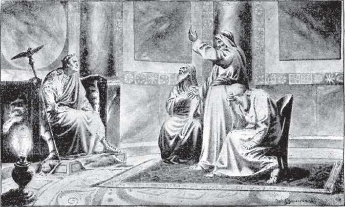 Воздух царских покоев был насыщен ароматом сандала, убранство поражало своей роскошью. Пол посередине залы был устлан ворсистым ковром, на котором возвышался трон. Вошедшие успели обвести взглядом помещение, и в памяти их остались резные оттоманки и позолоченные кресла, опахала, вазы, музыкальные инструменты; золотые канделябры, отражавшие свет горевших в них свечей; стены, расписанные сладострастными сюжетами в стиле греческих школ живописи, при одном взгляде на которые фарисеи в святом негодовании закрыли бы глаза. Но тут же внимание их сосредоточилось на сидевшем на троне Ироде, облаченном в то же одеяние, в котором он посетил собрание богословов и толкователей законов.