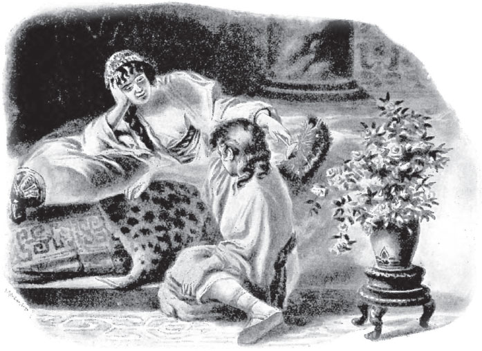 Юноша, за которым мы следуем, медленно прошел по крыше своего дома и приблизился к башенке, возвышающейся на северо-западном углу здания. Будь он пришлецом в этих местах, он наверняка задержал бы свой взор на ней, отметив для себя то, что позволяла различить темнота, – темная масса, низкая, решетчатая, со сводом, опирающимся на столбики. А так – он вошел в дверь, миновав наполовину поднятую завесу. Внутри было темно, лишь в арочные проемы виднелось небо, усыпанное крупными звездами. На фоне одного из этих проемов он увидел фигуру полулежащей на подушках софы женщины, смутно различимую даже под белым покрывалом. При звуках его шагов по полу веер в ее руке прекратил движение и сверкнул светом звезды, преломленным одним из драгоценных камней, которыми он был усыпан. Женщина села на софе и позвала юношу: