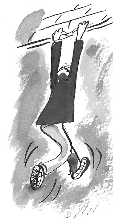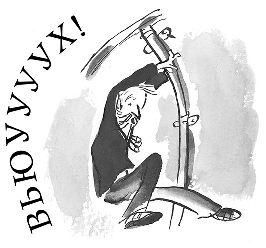 Мама с папой хором ахнули, закрывая рты руками, когда дедушка лихо, точно заправский акробат, перемахнул с желоба на трубу. На миг все замерло. Дедушка крепко цеплялся за верх трубы. Но, похоже, на такой вес труба была не рассчитана. Внезапно она оторвалась от стены и принялась стремительно изгибаться вниз.