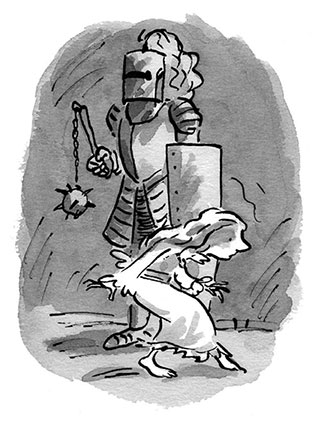 Девочка все так же на цыпочках двинулась мимо старинного рыцарского доспеха, стоявшего в карауле у парадной двери. Она очень-очень старалась ничего не задеть, чтобы оружие, которое он держал в латной рукавице – тяжелый цеп, – не упало на пол. От утыканного шипами шара и тяжелой цепи непременно раздался бы ужасный ЛЯЗГ.