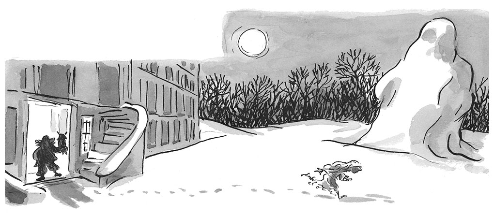 Полная луна висела низко над горизонтом, заливая светом глубокие сугробы вокруг. Девочка так быстро перебирала ногами, что почти не чувствовала холода. Она мчалась стремительно и отчаянно, едва разбирая дорогу. И хотя было не очень темно, чуть не налетела на стоящего на лужайке огромного снеговика. Подбежав к нему почти вплотную, Стелла осознала, что он по меньшей мере вдесятеро выше ее. Обернувшись на бегу, она увидела, что тетя возвышается на пороге, а Вагнер сидит у нее на плече. Стелла даже испугалась, что тетя не пытается ее догонять, а стоит совершенно неподвижно. Так, словно у нее все под контролем.