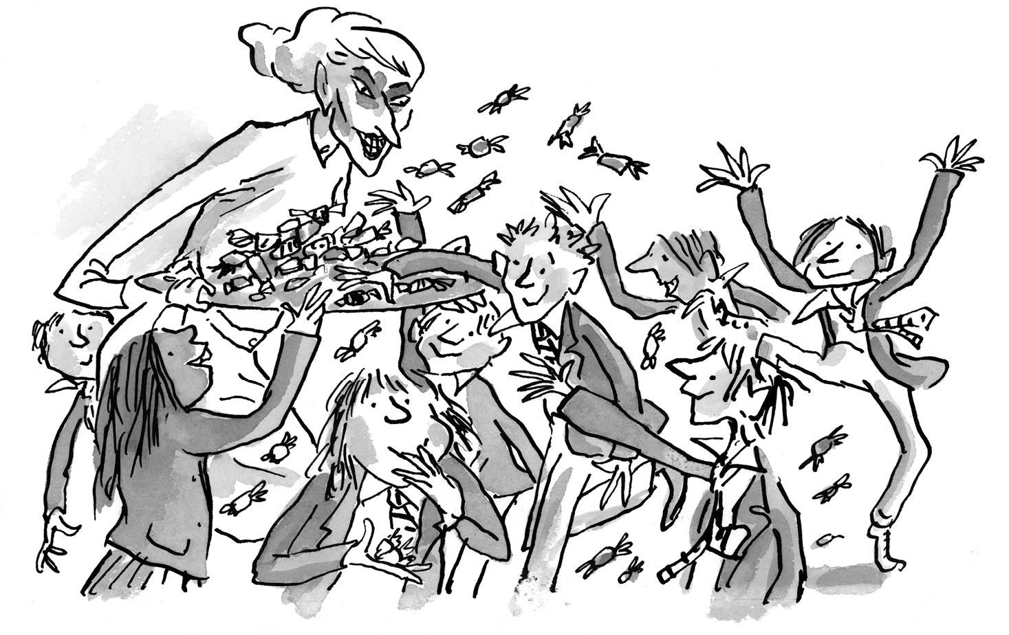 В одно мгновение сотни детей ринулись вперед и принялись расхватывать сладости. Но чем больше они брали конфет, чем больше от жадности набивали рты и карманы, тем больше становилось конфет на подносе. Все больше, и больше, и больше.