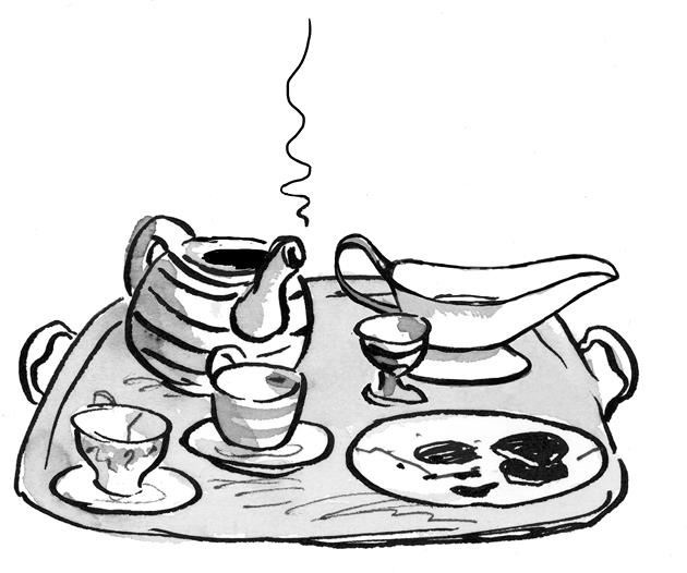 Вот и сейчас он достал маленький надтреснутый заварочный чайник без крышки и водрузил его на поднос из школьной столовой. А потом вытащил из буфета две чашки – а больше у них и не было, так что Альфи пришлось соображать на ходу. В конце концов он отыскал подставку для яиц – придется самому пить из нее. Роль молочника исполнял соусник, который мальчик купил на благотворительной распродаже. Последней он гордо извлек щербатую тарелку и положил на нее три крошащихся шоколадных печенья с закончившимся сроком годности. Продавец из местной газетной лавки отдал Альфи это печенье даром несколько дней назад, когда у мальчика был совсем уж голодный вид.