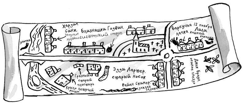 Альфи исполнил приказ. Габз два раза проверила, надежно ли заперта дверь, а потом развернула на мокром и грязном полу здоровенный бумажный рулон, который притащила с собой. Опустившись на колени, они оба принялись рассматривать плакат. Альфи вскоре понял, что это гигантская карта города. Габз довольно подробно нарисовала ее, а на некоторых домах еще и что-то подписала разноцветными фломастерами.