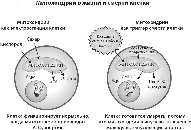 Митохондрии также управляют гибелью клеток. В конечном итоге все клетки погибают, и своевременная гибель клеток имеет решающее значение для здоровья. Когда митохондрия дает сигнал, клетка открывается потоку кальция, который убивает ее, что можно назвать «самоубийством», или запрограммированной гибелью клетки (техническое название для этого явления – апоптоз). Клетки, которые не умирают, когда их время истекло, будут постоянно расти за счет всех других клеток, превращаясь в раковые.