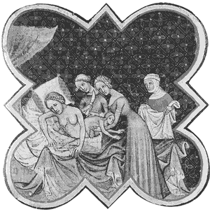 Средневековая операция по извлечению младенца из чрева матери путем кесарева сечения, проводимая в спальном покое роженицы.
