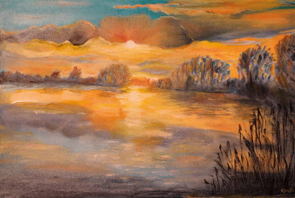 Вечерний посвист белых совЛовлю в оранжевое платье.На тонком льду весенний плес,Искря, свое рисует счастье.Поет в дыханье островномЖеланьем вырваться из плена.И холод страстно борется с теплом,Кидая седину из гобелена.Восходит солнце. Все бежитРучьями желтыми на небо.Заходит плавно, все блестит.Камыш звенит в ветру свирепо.А кисти можжевельникаПод жемчугом слезы,Как серьги предзакатные,Лазурь льют на стволы.Смешалась с синим небом полынья.То скроется, то вспыхнет вновь огниво.И вторит эхом русская земля:Люби меня, любой я так красива!