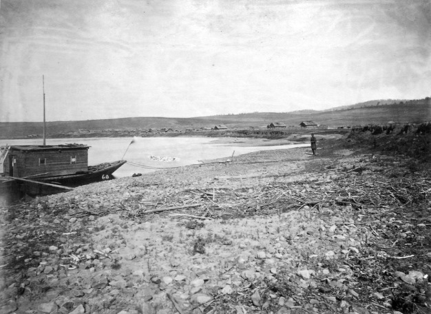 Ил. 1. Казацкая станица в низовье Аргуни, конец XIX века. Люди, животные и товары переправлялись по реке на баржах (Фотоальбом. Амур: От реки Аргуни до с. Покровской. Б. м., б. и. Дальневосточная государственная научная библиотека)