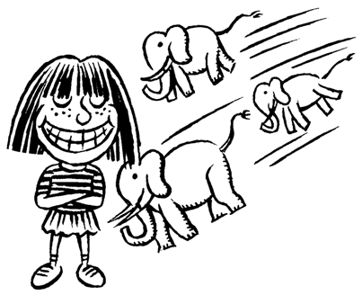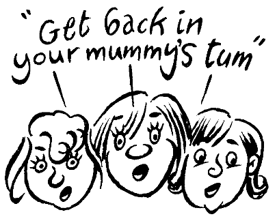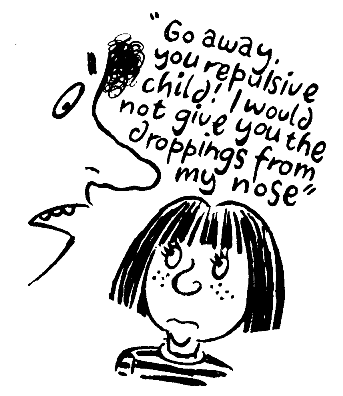 Well, we got in and first thing we know is old Misery Guts is there waiting for us, hiding behind the door. All in one breath she says, “Mrs-Small-I-really-must-complain-about-the-state-of-the-bathroom-it-looks-as-if-a-bomb-has-hit-it.” To which Mum chirps, “We should be so lucky!” and goes racing up the stairs two at a time with me giggling behind her.