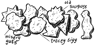 So that was what we did. We made a Misery Guts shape and an old Sourpuss shape, and Mum made Nan and Grandy shapes, and I made Tracey Bigg and Miss Foster shapes, and then we just went mad and made any old shapes that took our fancy. Shapes with big heads, and shapes with big feet, and shapes with big bums. Fat shapes, skinny shapes. Tall shapes, short shapes. Shapes of all kinds!
