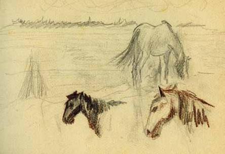 Шалун, Копыток и Буланый – первые лошади, на которых научил меня ездить верхом сын конюха Иван Баранов. 1947. Зарисовка И. Б. Воробьевой-Урновой.