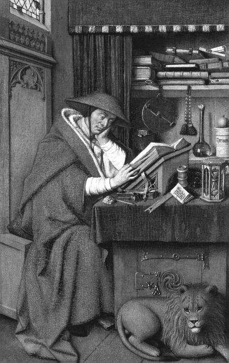 Приступая к этой медитации, мы надеемся сопоследовать мастеру, долгое время медитировавшему над своим предметом, Альбрехту Дюреру, на извилистом пути, приведшем его к абсолютному шедевру, гравюре «Иероним в келье»*. Дюрер, четырнадцать раз менявший трактовку фигуры этого учителя Церкви, внезапно, после многих попыток конвенциональных толкований, испытал прозрение о сущности изображаемой личности и через несколько лет достиг адекватной формы. Всё анекдотическое, стаффажное, эффектное было оставлено позади, неизбежные привнесения нашли своё место в рамках целого; в глубоком безмолвии пронизанной солнцем кельи совершается нечто колоссальное, что, в сущности, присутствовало всегда: и у реального отца Церкви, и в его воскрешённой гуманистами личности, как они её поняли, и, наконец, в мировоззрении самого Дюрера.
