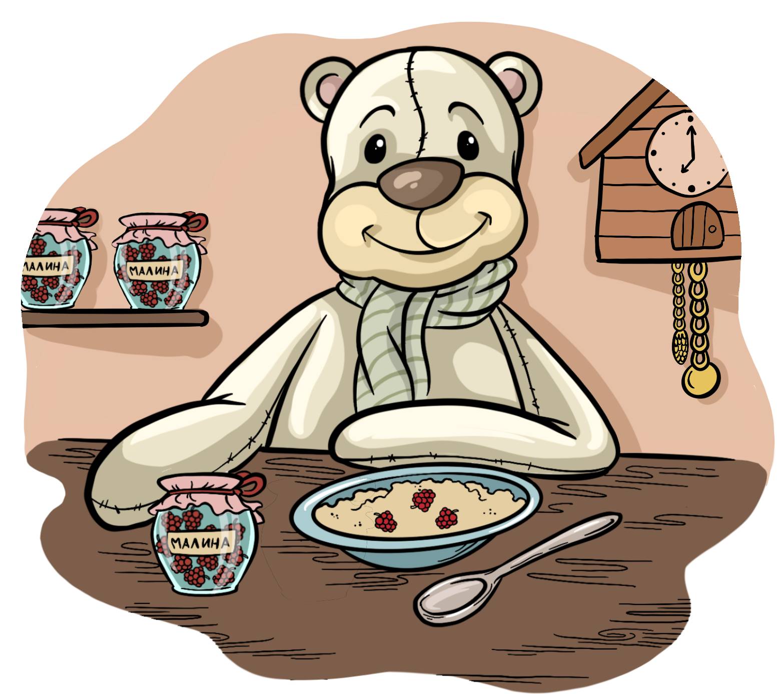 Медвежонок любил завтракать кашей с малиной. Он доставал красную с цветочками тарелочку, накладывал теплую ароматную кашу, а сверху посыпал малиной. М-м-м, как вкусно!