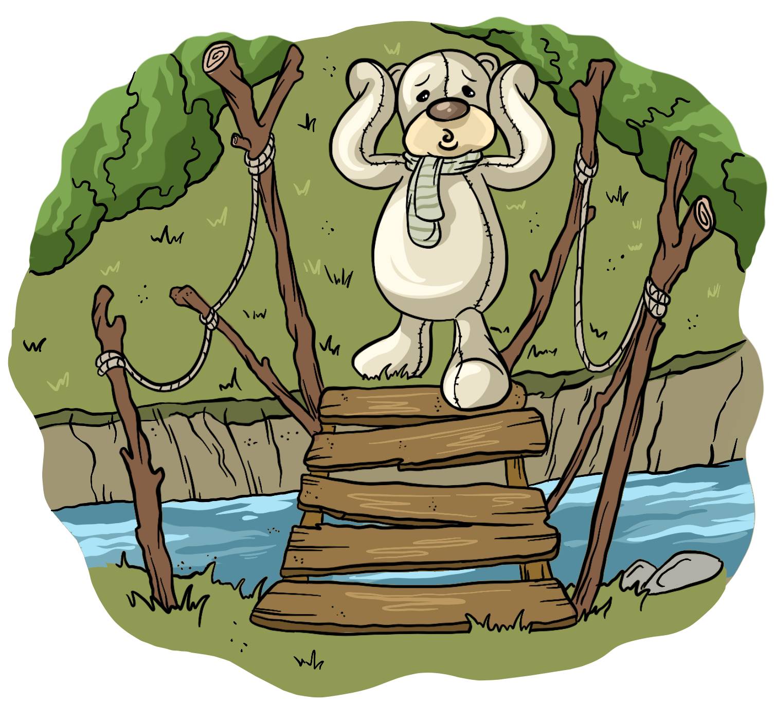 Что же делать? Как перейти речку? Медведи не очень-то любят падать в речку с моста. Как здорово, что Миша взял с собой мармеладки, придающие силу и храбрость. Он съел сразу три мармеладки и уверенно шагнул на мостик. Мостик был деревянный и раскачивался из стороны в сторону. Косолапый представил, что это такие качели, а он любил качаться на качелях. И, проходя по мостику, он словно раскачивался и шептал про себя «раз-два, раз-два». Так было намного легче делать шаги, и с каждым «раз-два» он приближался к другому берегу.