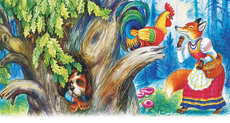 Услыхала петуха лиса; захотелось ей петушьим мясом полакомиться. Вот она подошла к дереву и стала петуха расхваливать: