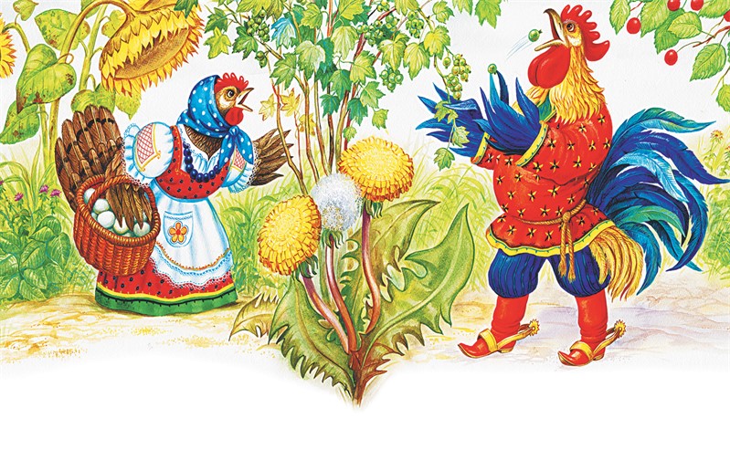 – Вот петух так петух! Такой птицы я никогда не видывала: и пёрышки-то какие красивые, и гребень-то какой красный, и голос-то какой звонкий! Слети ко мне, красавчик.