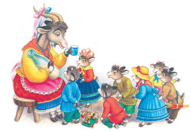 Вы, детушки, вы, батюшки,Отопритеся, отворитеся!Ваша мать пришла,Молока принесла…Полны копытцы водицы!Козлятки выслушали и говорят: