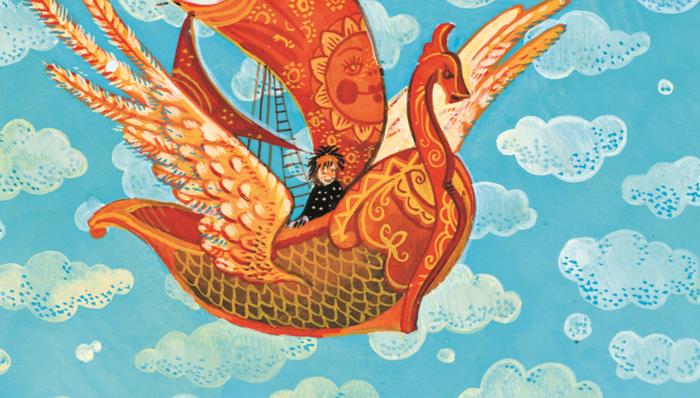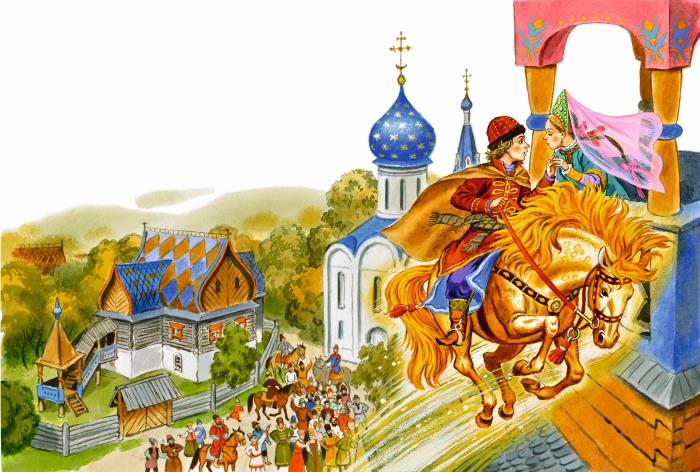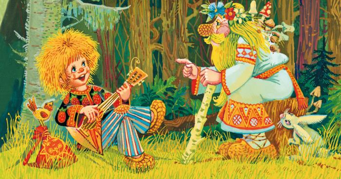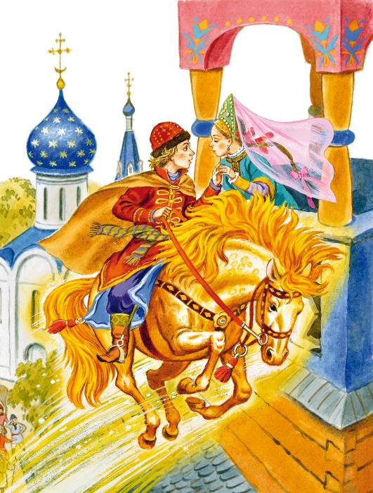 Он сел, и опя́ть полете́ли. Лете́ли-лете́ли, глядь – идёт челове́к в лес, а за плеча́ми вяза́нка дров. «Здоро́в, дя́дьку! Заче́м в лес дрова́ несёшь?» – «Да э́то не просты́е дрова́». – «А каки́е же?» – «Да таки́е: ко́ли разбро́сить их, так вдруг це́лое во́йско я́вится». – «Сади́сь с на́ми!» Сел он к ним, и полете́ли да́льше. Лете́ли-лете́ли, глядь – челове́к несёт куль соло́мы. «Здоро́в, дя́дьку! Куда́ несёшь соло́му?» – «В село́». – «Ра́зве в селе́-то ма́ло соло́мы?» – «Да э́то така́я соло́ма, что как ни будь жа́рко ле́то, а ко́ли разброса́ешь её – так зара́з хо́лодно сде́лается: снег да моро́з!» – «Сади́сь и ты с на́ми!» – «Пожа́луй!» Э́то была́ после́дняя встре́ча; ско́ро прилете́ли они́ до ца́рского двора́.