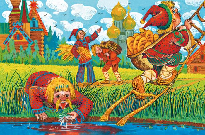 Лете́ли-лете́ли, глядь – несёт челове́к за спино́ю по́лон мех хле́ба. «Здоро́в, дя́дьку! Куда́ идёшь?» – «Иду́, – говори́т, – добыва́ть хле́ба на обе́д». – «Да у тебя́ и так по́лон мешо́к за спино́ю». – «Что тут! Для меня́ э́того хле́ба и на оди́н раз укуси́ть не́чего». – «Сади́сь-ка с на́ми!» Объеда́ло сел на кора́бль, и полете́ли да́льше. Лете́ли-лете́ли, глядь – хо́дит челове́к вокру́г о́зера. «Здоро́в, дя́дьку! Чего́ и́щешь?» – «Пить хо́чется, да воды́ не найду́». – «Да пе́ред тобо́й це́лое о́зеро; что ж ты не пьёшь?» – «Э́ка! Э́той воды́ на оди́н глото́к мне не ста́нет». – «Так сади́сь с на́ми!»