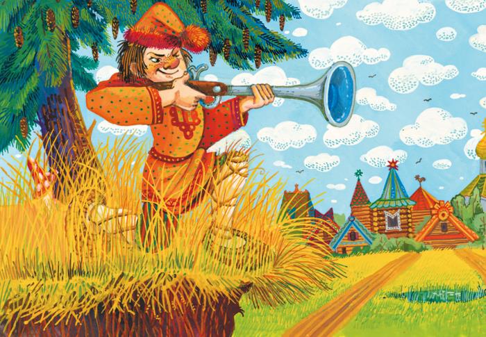 Лете́л-лете́л, глядь – лежи́т внизу́ на доро́ге челове́к, у́хом к сыро́й земле́ припа́л. «Здоро́в, дя́дьку!» – «Здоро́в, небо́же». – «Что ты де́лаешь?» – «Слу́шаю, что на том све́те де́лается». – «Сади́сь со мно́ю на кора́бль». Тот не захоте́л отгова́риваться, сел на кора́бль, и полете́ли они́ да́льше. Лете́ли-лете́ли, глядь – идёт челове́к на одно́й ноге́, а друга́я до у́ха привя́зана. «Здоро́в, дя́дьку! Что ты на одно́й ноге́ ска́чешь?» – «Да ко́ли б я другу́ю отвяза́л, так за оди́н бы шаг весь свет перешагну́л!» – «Сади́сь с на́ми!» Тот сел, и опя́ть полете́ли. Лете́ли-лете́ли, глядь – стои́т челове́к с ружьём, прице́ливается, а во что – неве́домо. «Здоро́в, дя́дьку! Куда́ ты ме́тишь? Ни одно́й пти́цы не ви́дно». – «Как же, ста́ну я стреля́ть бли́зко! Мне бы застрели́ть зве́ря и́ли пти́цу вёрст за ты́сячу отсю́да: то по мне стрельба́!» – «Сади́сь же с на́ми!» Сел и э́тот, и полете́ли они́ да́льше.