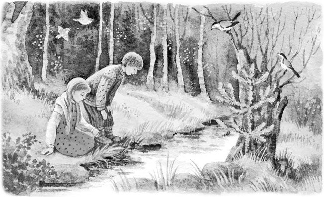 Детям стало скучно, что все заняты своим делом и никто не хочет играть с ними. Они подбежали к ручью. Журча по камням, пробегал ручей через рощу.