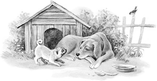 К Полкану подбежал маленький Мопс и стал на него кидаться и лаять; хватал его зубами за огромные лапы, за морду и, казалось, очень надоедал большой и угрюмой собаке.