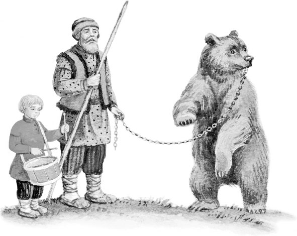 – А ну-ка, Миша, – говорит нижегородец, дёргая медведя цепью, – встань, подымись, с боку на бок перевались, честным господам поклонись и молодкам покажись.