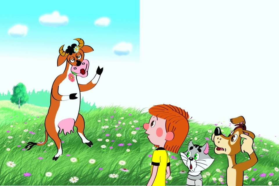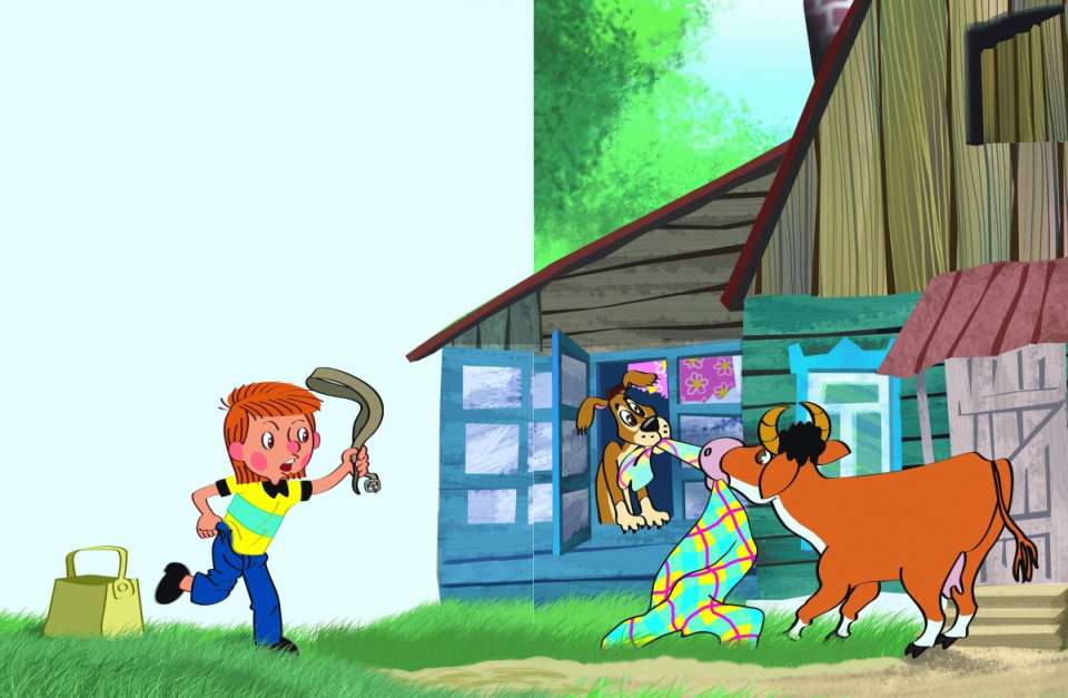 А они молчат. Только на него глаза таращат. Тут он увидел, что все цветы на окне поедены и занавесок нет, и всё понял. Вынул он ремень из брюк – да как хлестнёт глупую корову! А корова, видно, балованная была. Она на дядю Фёдора с рогами. Он – бежать. Но брюки у него без ремня были, он в них и запутался. Вот-вот корова бодать начнёт.